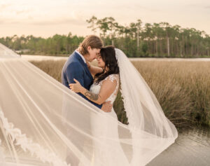 Bowen and Brittany were married on an early June day in a picturesque wedding ceremony at sunset on Orange Beach. The wedding weekend was filled with meaning as family and friends came together for the couple’s nuptials. The bride, a fine jewelry designer, gifted her mother, mother-in-law and bridesmaids custom earrings, pearl necklaces and bracelets to match their own style as a keepsake from the special day. The ceremony and reception both reflected images of A Midsummer Night’s Dream, capturing the beauty of nature with a clean, garden-inspired feel. Cocktails and Cajun-inspired fare paired perfectly with music from the 10-piece band as guests took to the dance floor. After hours of joyous celebration, the new Mr. and Mrs. Flowers exited under a full moon to a limousine decorated with white and pink roses.