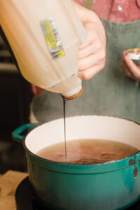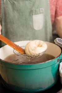 7. Preheat oven to 425 degrees. Meanwhile, bring a large pot of water to a boil and add barley malt syrup to the water. Using a slotted spoon or skimmer, lower each bagel, one or two at a time, into the boiling water. Boil one minute, then flip bagel and boil one minute more. Transfer bagels to an oiled baking sheet.