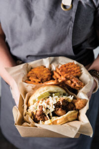 This signature sandwich features a fried chicken thigh with mustard, coleslaw and pickles. If waffle fries on the side don’t do the trick, try the loaded waffles fries, complete with queso, bacon, ranch, sour cream, black olives and jalapenos.