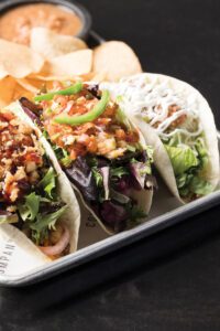 Build your own taco plate alongside your choice of Mexican corn, basmati rice or black beans. Pictured on the opposite page, from left to right, is the Belly of the Beast, the Backwoods Hawaiian and the Seasoned Ground Beef taco.