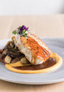 Fresh, local Gulf fish rests atop butternut squash puree, paired with fingerling potatoes, mushrooms and marinated tomatoes.