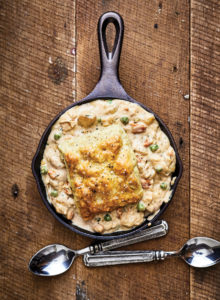 There’s no complicated crust required for this down-home pot pie. The filling is developed in a skillet in 20 minutes or less, and after topping it with simply baked biscuits, that same skillet can go directly to the table for a beautifully rustic presentation. The addition of shrimp puts a Gulf Coast spin on this comfort food classic.