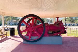 Displayed in Chickasaw’s Maritime Park, adjacent to City Hall, is the city’s centerpiece, a large red motor, bigger than a minivan. No, it does not drive the exhibit. It is the exhibit.