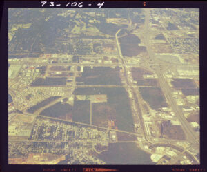 Aerial photograph of a shrinking Wragg Swamp in 1973 with Eslava Creek paralleling I-65, and Springdale Plaza and Bel-Air Mall to the right of the cloverleaf. The Alec and Roy Thigpen Photography Collection, the Doy Leale McCall Rare Book and Manuscript Library, University of South Alabama.