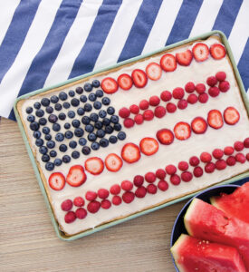 5. Make a straight row of raspberry slices across the bottom of the cookie. Add a row of strawberries, leaving a 1-inch space between the rows. Repeat once, or until the cookie resembles an American flag.