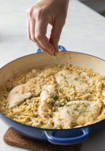 5. Add lemon juice and half and half to the orzo, stirring to combine. Finally, nestle the chicken into the pan and cook another 5 minutes. Plate and serve immediately.
