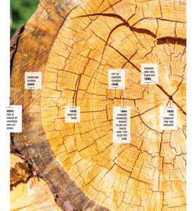 Once it was down, we all began the ritual of counting the rings, the poor man’s version of dendrochronology. A few of the old-growth rings were tight enough to require a magnifying glass. My best tally has the tree at around 175 years old, which means it had sprouted around 1850, survived the Civil War, the great late 19th century longleaf cutting, all of our hurricanes named and unnamed and all of Fairhope’s history to date. It was already around 50 years old when Fairhope was settled.