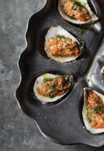 4. Bump the oven up to broil. Place the opened oysters on an oven-proof pan and top with 1 tablespoon of squash mixture (if the oysters are small use less and vice versa — the oyster is the star here). Broil 3 – 5 minutes until the topping begins to take color. Be careful to not overcook the oysters. Serve immediately. Makes 2 dozen