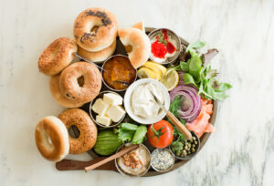- Don’t forget a few extras! Mix your own “everything bagel” seasoning with sesame seeds, poppy seeds, sea salt, dried garlic and dried onions. Guests will love to sprinkle it over a schmear.