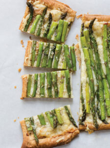 3. Rinse the asparagus, dry and discard the tough ends. Remove pastry from oven and sprinkle with cheese. Arrange asparagus in a single layer over cheese. Brush with oil and season with salt and pepper.