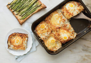 1. Preheat oven to 375 degrees. If bread is not a day old or still feels moist, arrange slices in a single layer on a baking sheet and bake, flipping once, until dry to the touch but not toasted, 5 – 10 minutes. Using a 2-inch ring, cookie cutter or sharp paring knife, cut a hole in the center of six bread slices. Trim bread to fit in two even layers in a 13-by-9-inch baking dish, with the whole slices on the bottom and the slices with holes on the top, forming six sandwiches. Remove from dish.