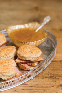 7. Add baked ham bites and a dollop of Jezebel Sauce (below) to each sliced scone.