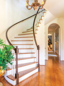 At the same time as he was designing the Gordon Stimpson House, Eugene Gray created another revivalist house with a different design pedigree for John and Margaret “Sister” Adams. Superficially, the Adams house has many of the same ingredients as the Stimpson house (one-and-a-half stories, front porch, dormers, symmetry), only the seasonings and cut are different. Gray and Sister Adams looked to Colonial Virginia, not the Gulf Coast, for both architecture and landscape. In its massing, elements, and detailing, the Adams house borrows from multiple buildings on Williamsburg’s famous Duke of Gloucester Street. The landscaping — boxwood beds and a cobbled drive — looked to the Tidewater. The interior of the Adams house blends Georgian and Federal forms. A delicious curvilinear staircase, Gray’s signature touch, enlivens the entrance hall. Rooms, formal and private, feature fabulous woodwork. When Sister Adams downsized, she sold her beloved home to Ben and Victoria Stimpson. Bucking a trend in Country Club Estates, the Stimpsons preserved the original house and constructed additions to the rear of the house.