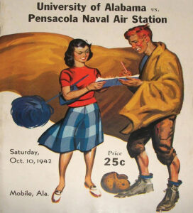 Following the attack on Pearl Harbor, Mobile went from a sleepy little southern port to a boom town manufacturing center. Nearly 100,000 new workers flooded into the city. The shipyards were hastily putting afloat Liberty and Merchant ships. Alcoa was cranking out alumina for airplanes and Brookley Field was building bombers. Boarding houses around town were sleeping men in shifts, and empty lots sprouted tents for all the new inhabitants. The federal government produced a documentary film, “Wartown,” to describe Mobile’s new progress and the challenges it faced. In the fall of 1942, right in the middle of all of this hustle and bustle, the city would host a college football game. And not just any football game, but one featuring perennial national championship contender: the University of Alabama Crimson Tide.