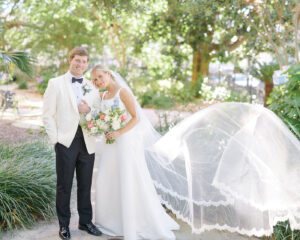Kaity and Alex say the best day of their lives would not have been possible without their wonderful friends, family and vendors by their side. The couple married on a clear summer day at the Cathedral-Basilica of the Immaculate Conception. The wedding party and guests then followed the newlyweds to Fort Conde Inn. The sounds of the high-energy Motown band Musical Fantasy provided the perfect soundtrack to the evening as the reception became a big dance party from the time the couple cut the cake. The bride and groom made their exit under glowing string lights and glittering sparklers to their waiting pedicab to start their new chapter as newlyweds.